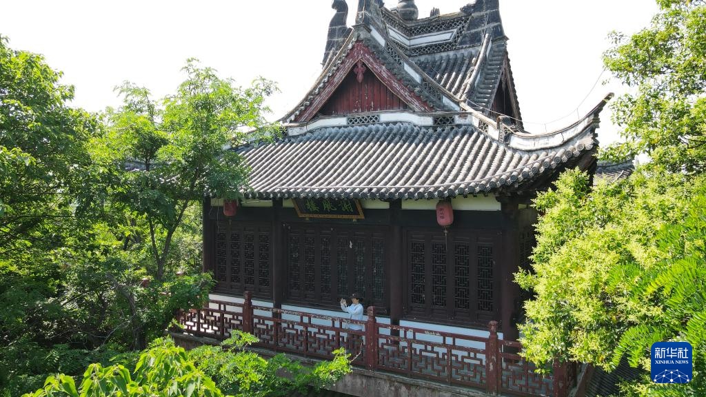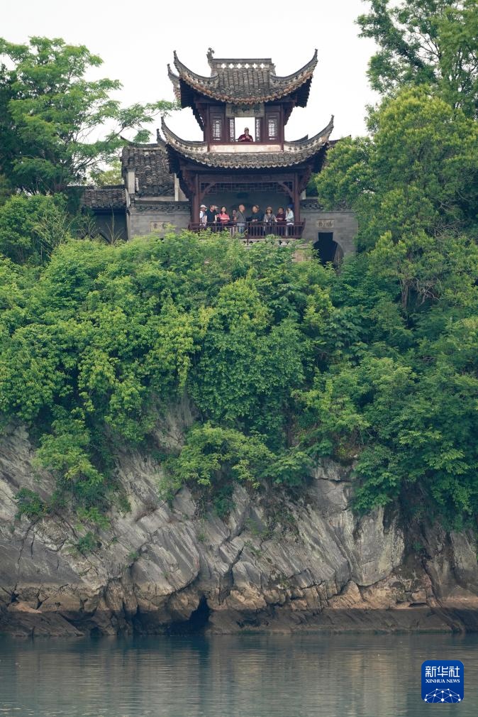 5月15日,在安徽省宣城市泾县桃花潭景区,游客登临怀仙阁赏景。