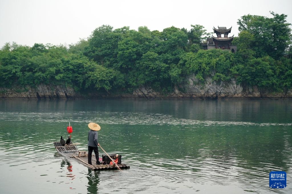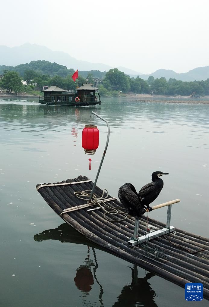 5月15日,在安徽省宣城市泾县桃花潭景区,游客乘船游览,两只鸬鹚站在竹筏上(无人机照片)。