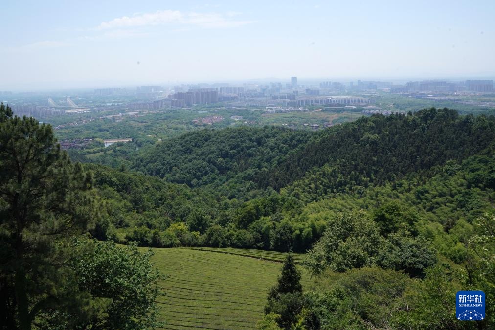 5月14日在安徽省宣城市敬亭山拍摄的茶园和城市景观。