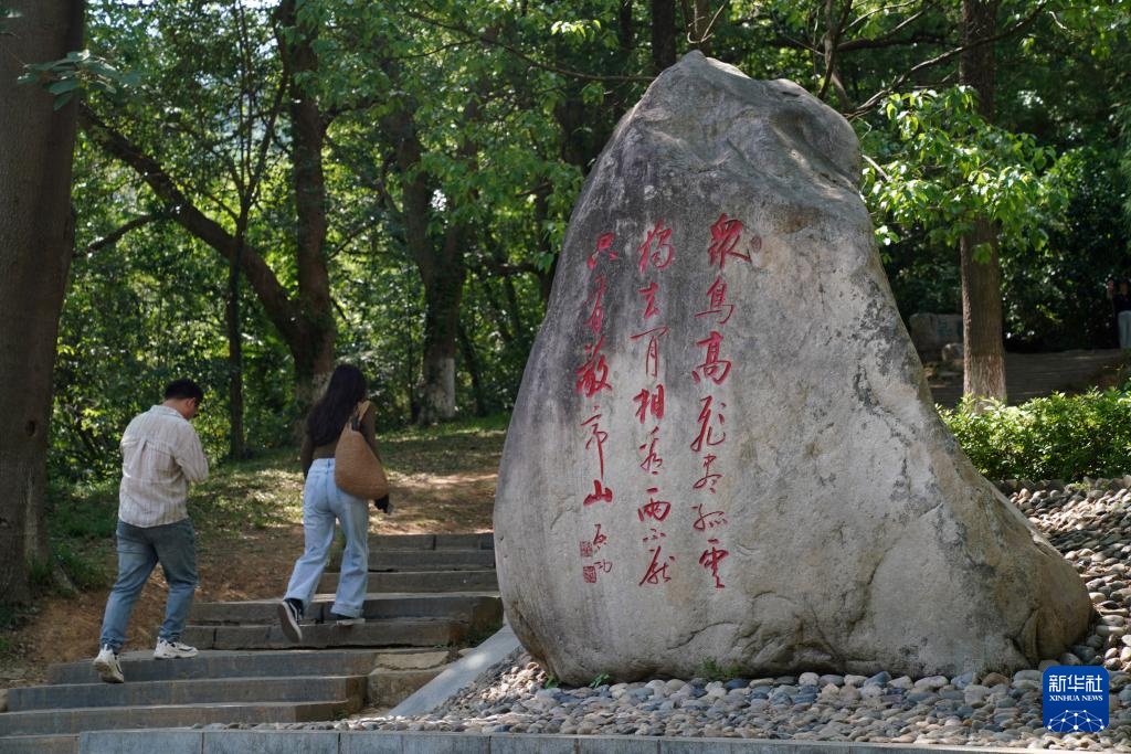5月14日,游客在安徽省宣城市敬亭山游览,石碑上刻有李白的《独坐敬亭山》。