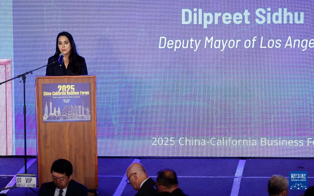 6月2日,美国洛杉矶市副市长迪尔普里特·西杜在洛杉矶举行的2025年中国—加州经贸论坛上发表主旨演讲。