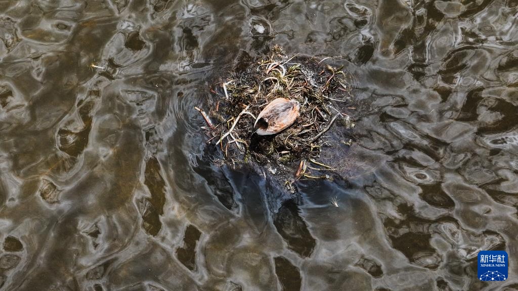 这是6月4日在青海隆宝国家级自然保护区拍摄的筑巢的凤头䴙䴘(无人机照片)。