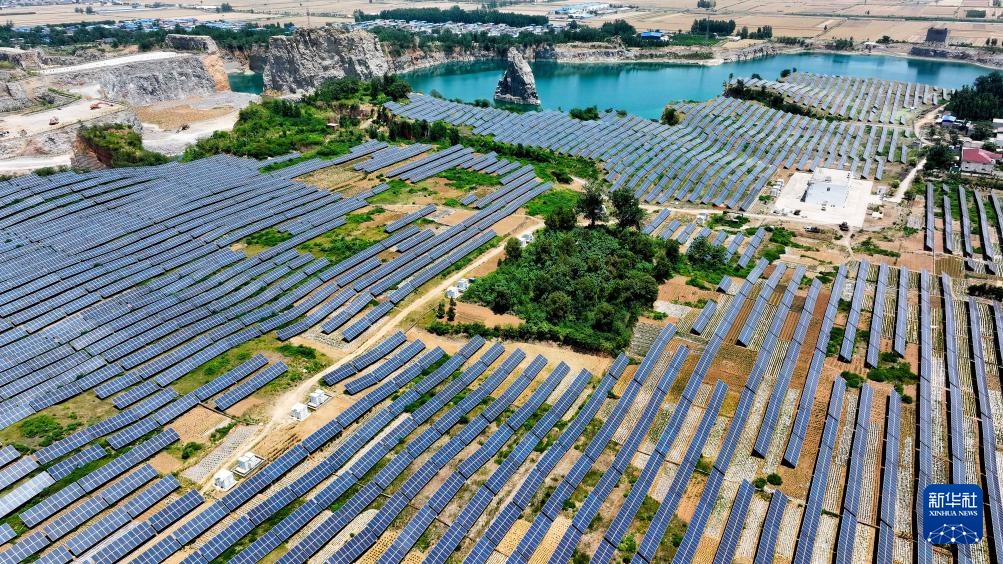 这是6月4日拍摄的菏泽市巨野县核桃园镇青龙山旅游度假区里的光伏发电项目。该度假区是当地对关停矿山、废弃矿坑进行综合治理和生态修复后打造而成的(无人机照片)。