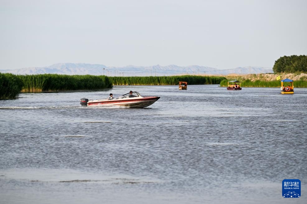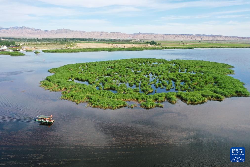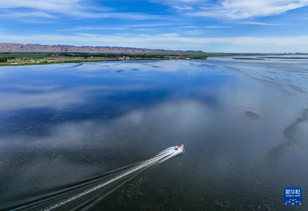 6月4日,在乌拉特前旗乌梁素海,一艘快艇驶过湖面(无人机照片)。