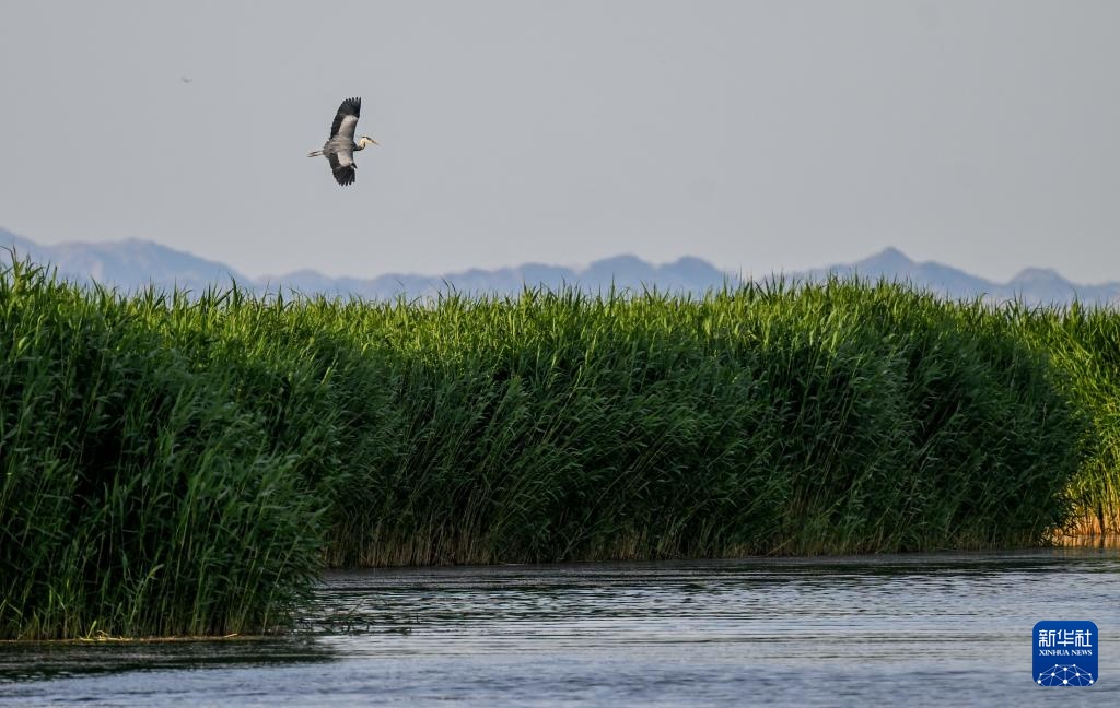6月4日,一只苍鹭在乌梁素海的芦苇荡上飞翔。
