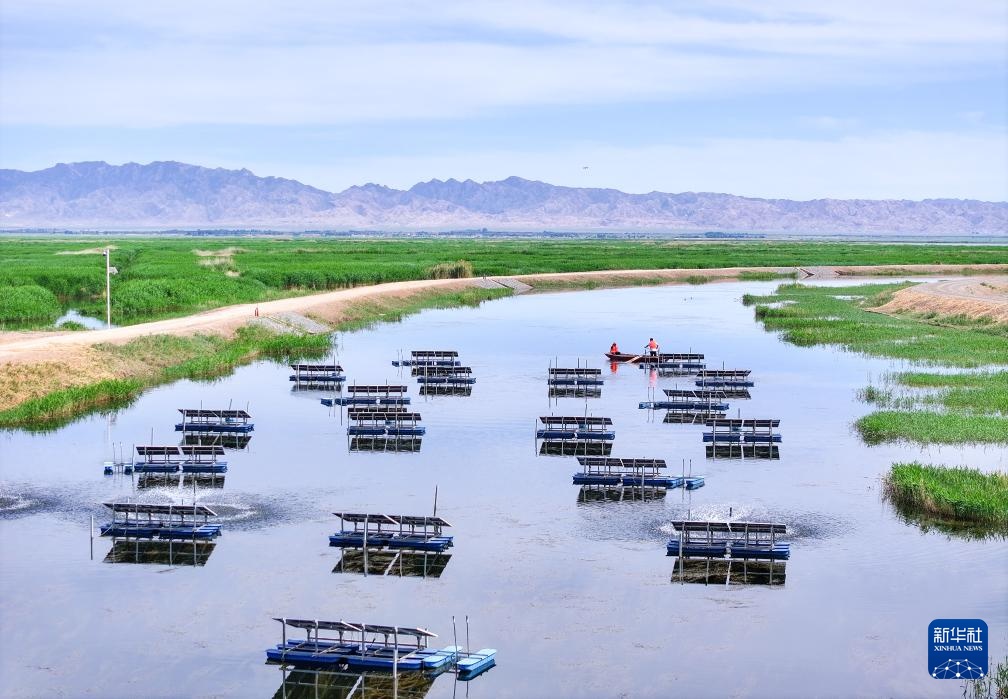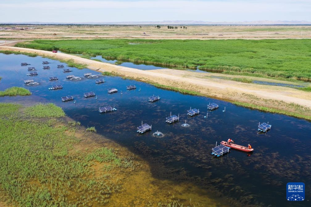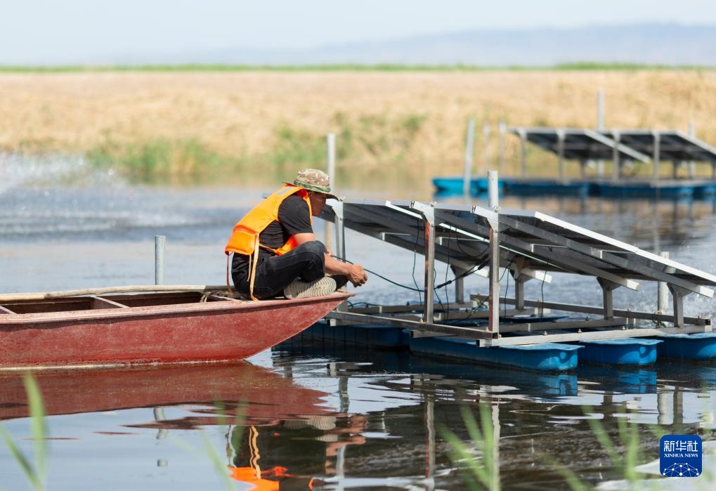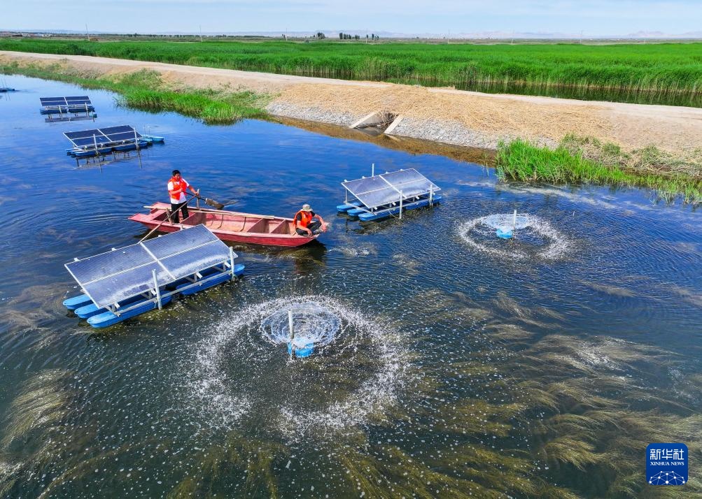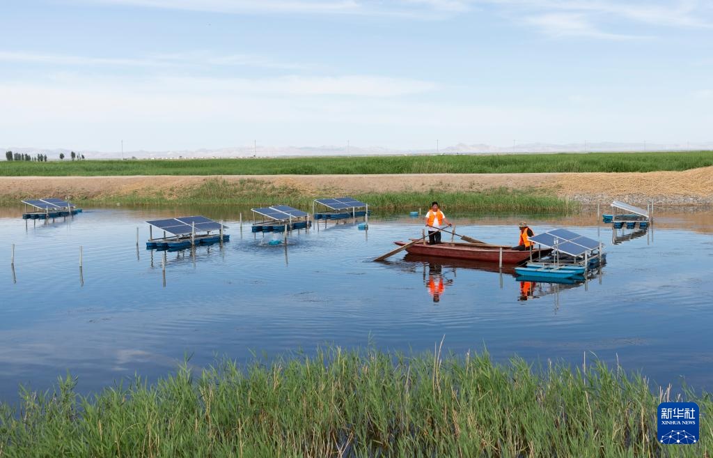 6月4日,在乌拉特前旗九排干人工湿地,工作人员在巡检太阳能曝气机。