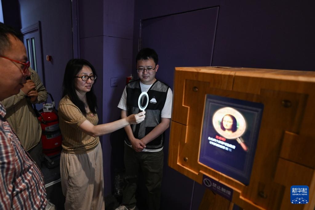 6月5日,参观者在展览上透过一片偏光镜观看与展览内容相关的科普影像。