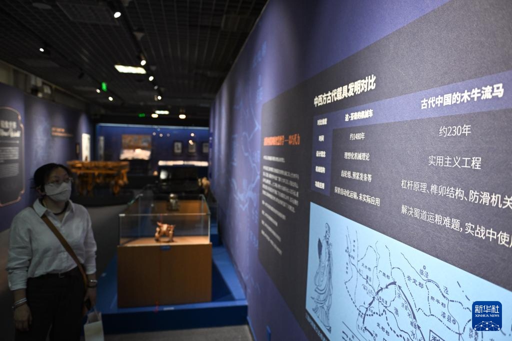 6月5日,参观者在观看展览中一处讲解中西方古代载具发明的展板。