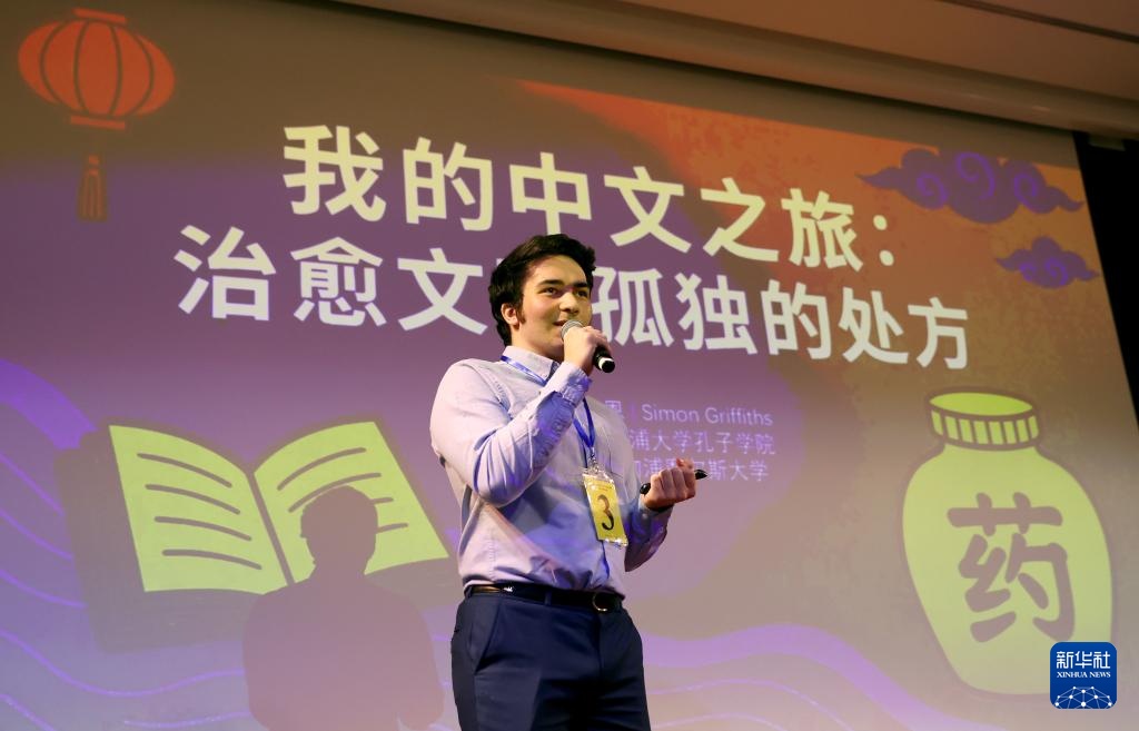 6月5日,在英国伦敦举行的“汉语桥”世界大学生中文比赛全英大区赛总决赛上,来自利物浦约翰摩尔斯大学的赛恩进行演讲。