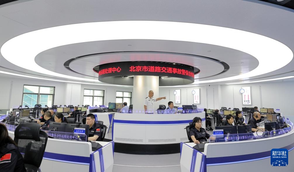 5月23日,在北京市公安局交管局北京道路交通事故警保合作远程处理中心,事故处理支队支队长于海涛(中)和民警在统筹调度全市轻微交通事故警情远程处置工作。