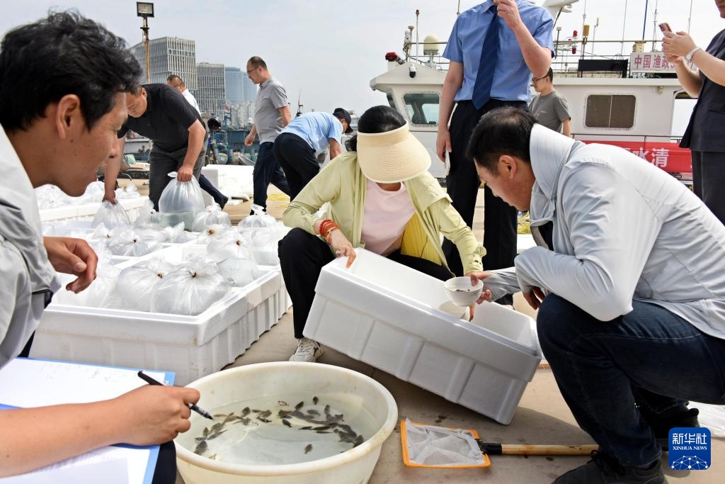 6月6日,在青岛西海岸新区积米崖码头,工作人员对即将投放的水产种苗进行抽检。
