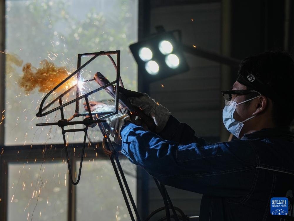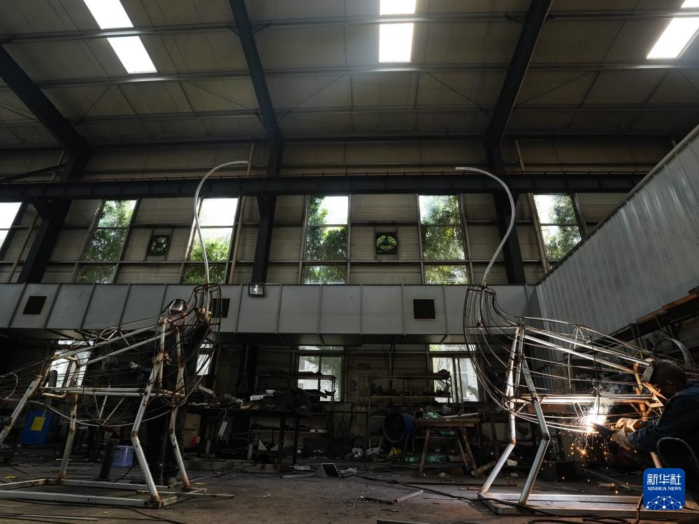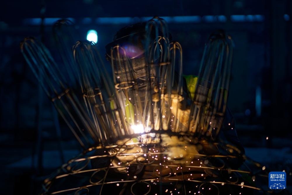 2025年6月4日,工作人员在四川省自贡市灯彩集团厂房内为彩灯焊接骨架。