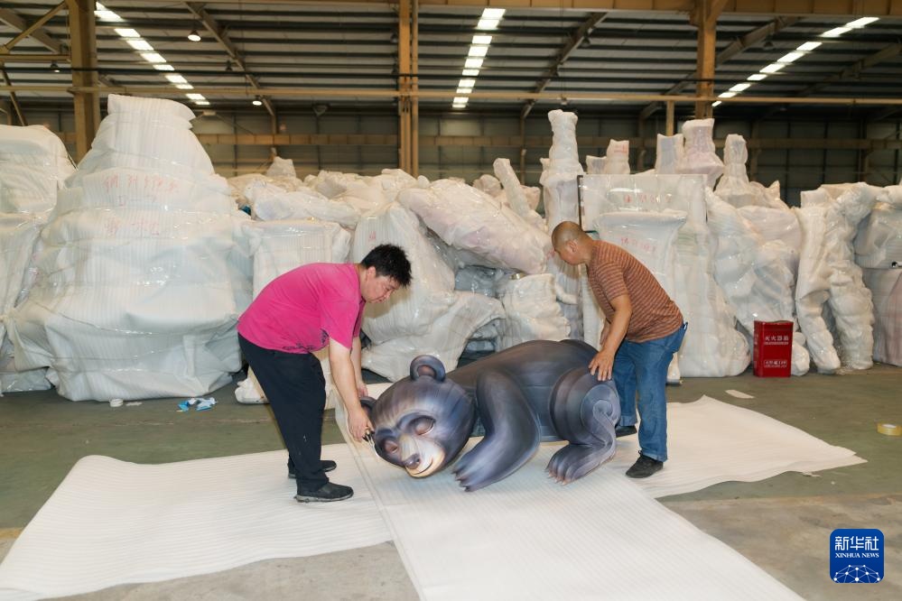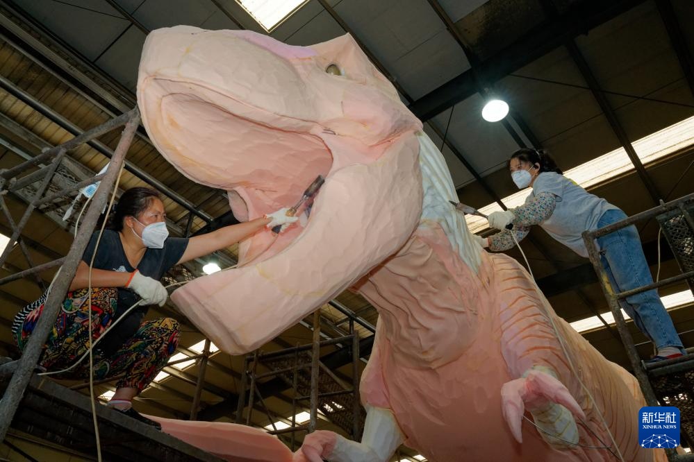 2025年6月4日,工作人员在四川省自贡市自贡亘古龙腾科技有限公司的厂房内为仿真恐龙进行精细造型工作。
