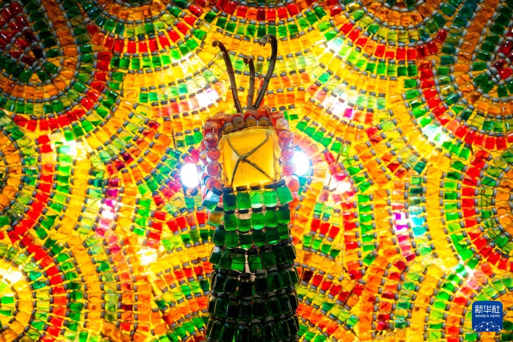 这是2025年6月5日在四川省自贡市中国彩灯博物馆拍摄的用玻璃药瓶制作的彩灯“孔雀开屏”。