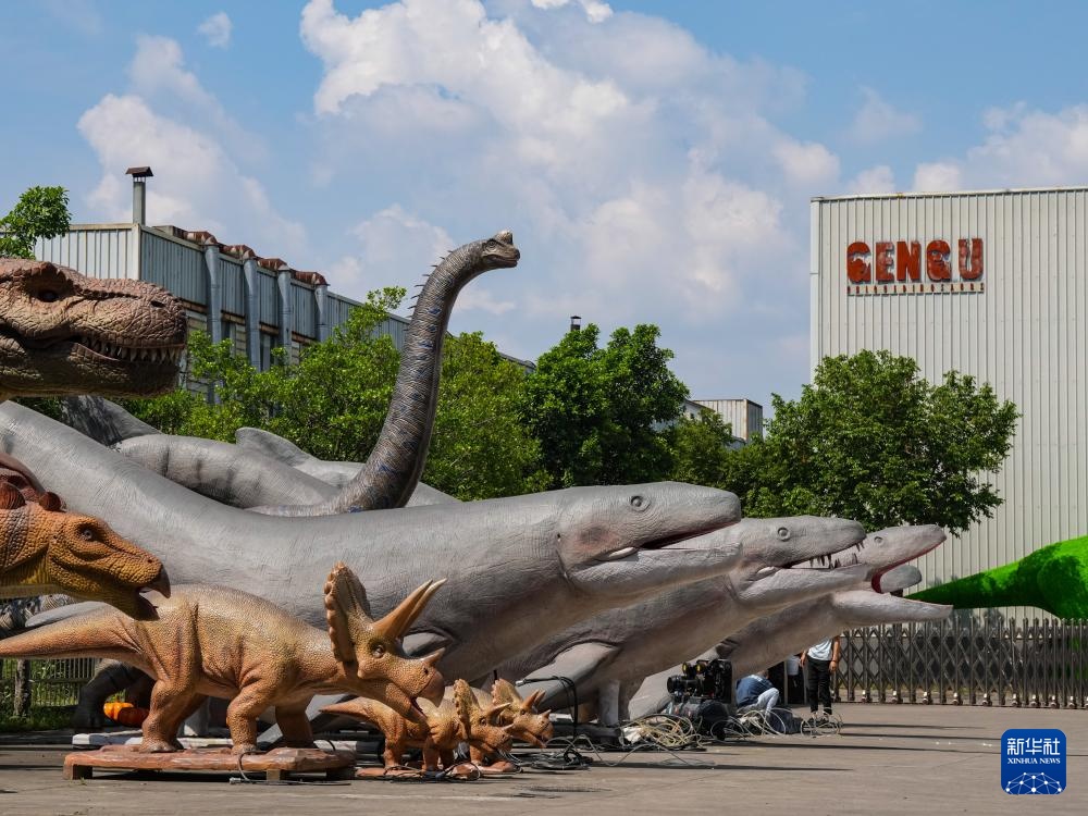 这是2025年6月4日在四川省自贡市自贡亘古龙腾科技有限公司拍摄的即将发往海外的仿真恐龙成品。