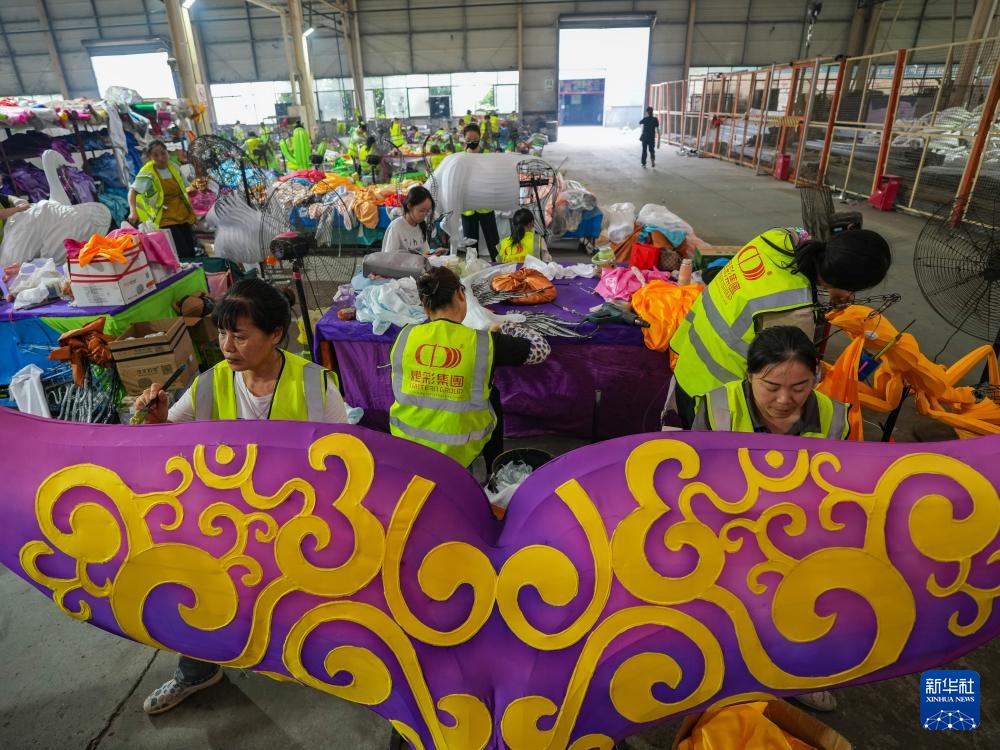 2025年6月4日,工作人员在四川省自贡市灯彩集团厂房内打包制作好的彩灯,准备发往海外。