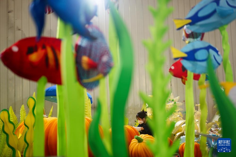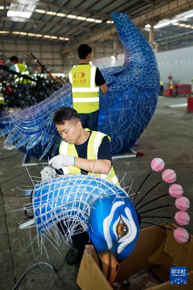2025年6月4日,工作人员在四川省自贡市灯彩集团厂房内为孔雀彩灯捆绑灯条。