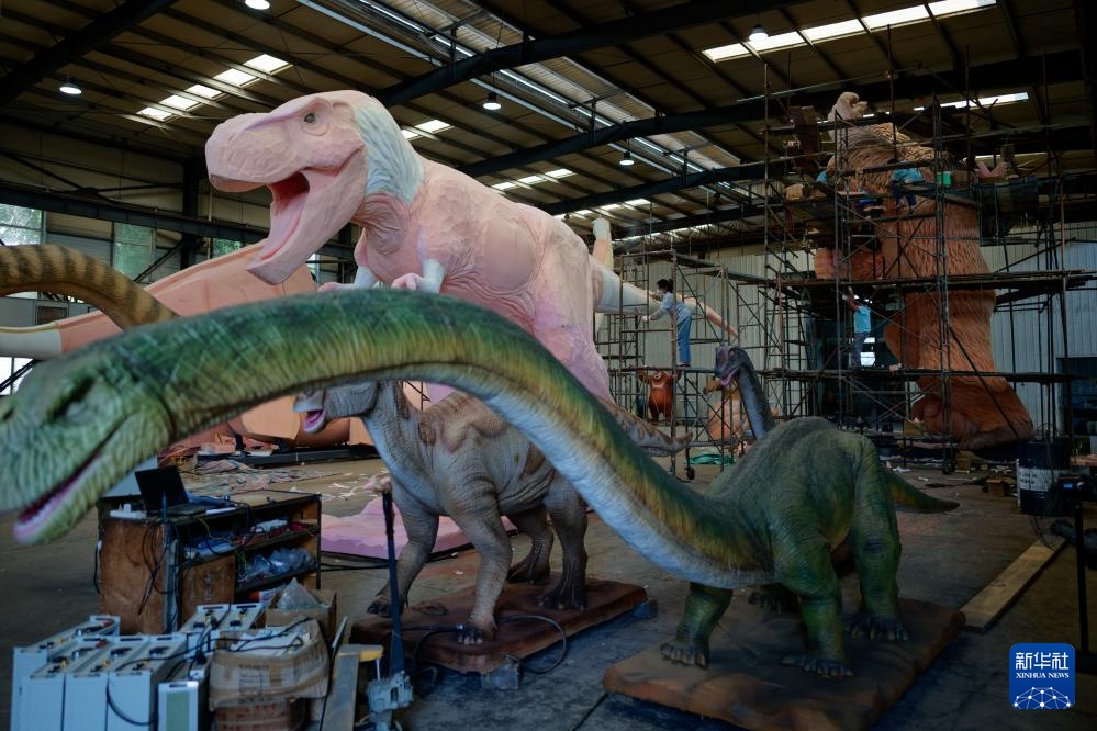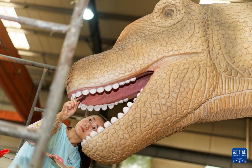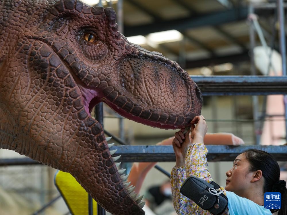 2025年6月4日,工人在四川省自贡市自贡亘古龙腾科技有限公司的厂房内为仿真恐龙安装牙齿。