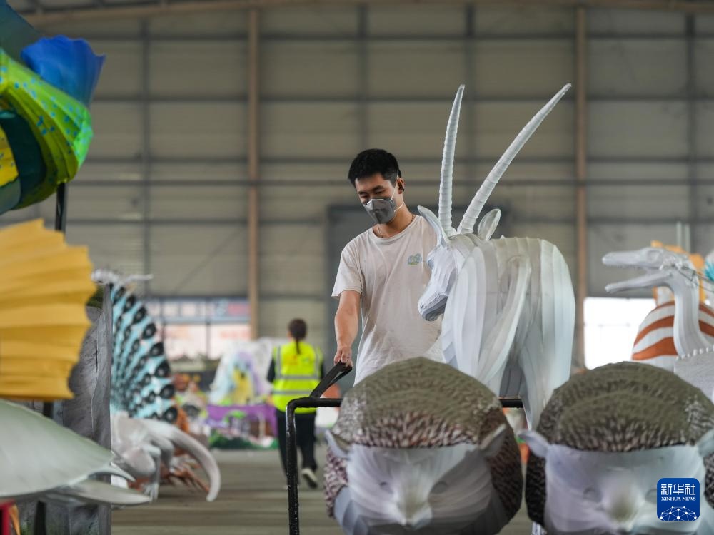 2025年6月4日,工人在四川省自贡市灯彩集团厂房内运送彩灯。
