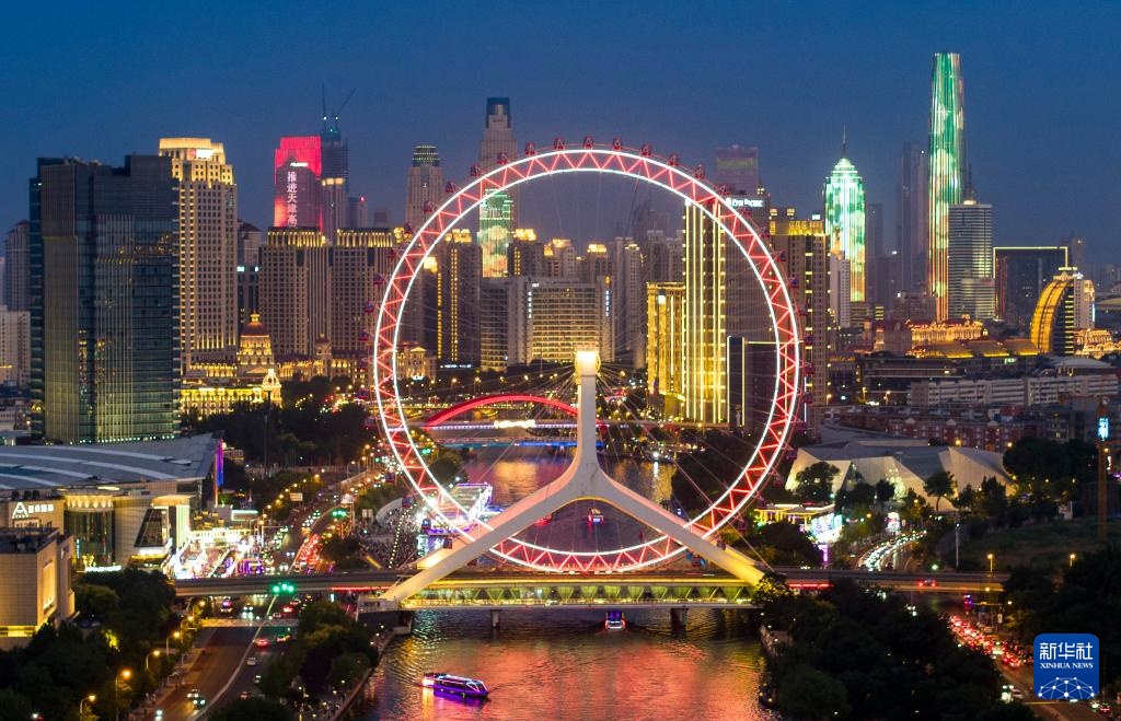 这是6月6日在“天津之眼”摩天轮附近拍摄的海河沿岸夜景(无人机照片)。