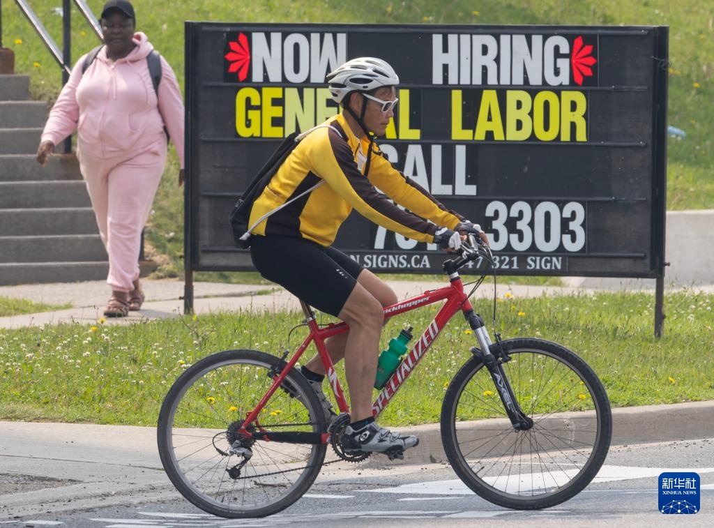 6月6日,在加拿大多伦多,一名骑行者从街头一处招聘广告牌前经过。