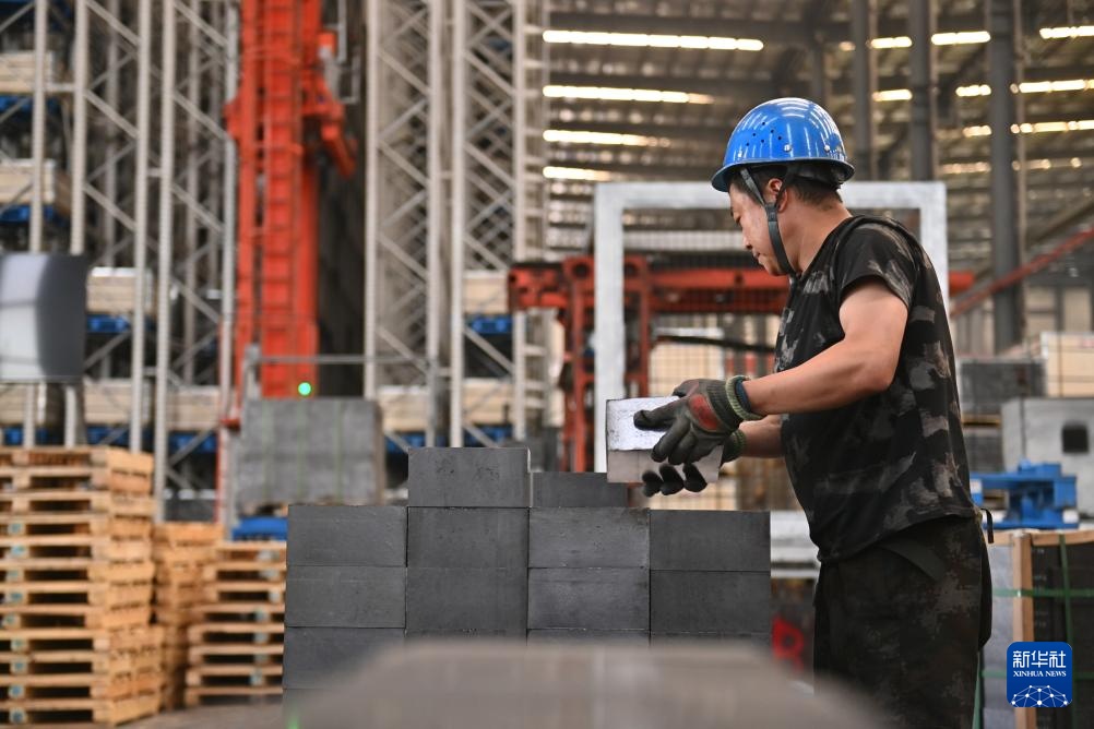 6月6日,工人在海城利尔麦格西塔材料有限公司搬运钢包镁碳砖。