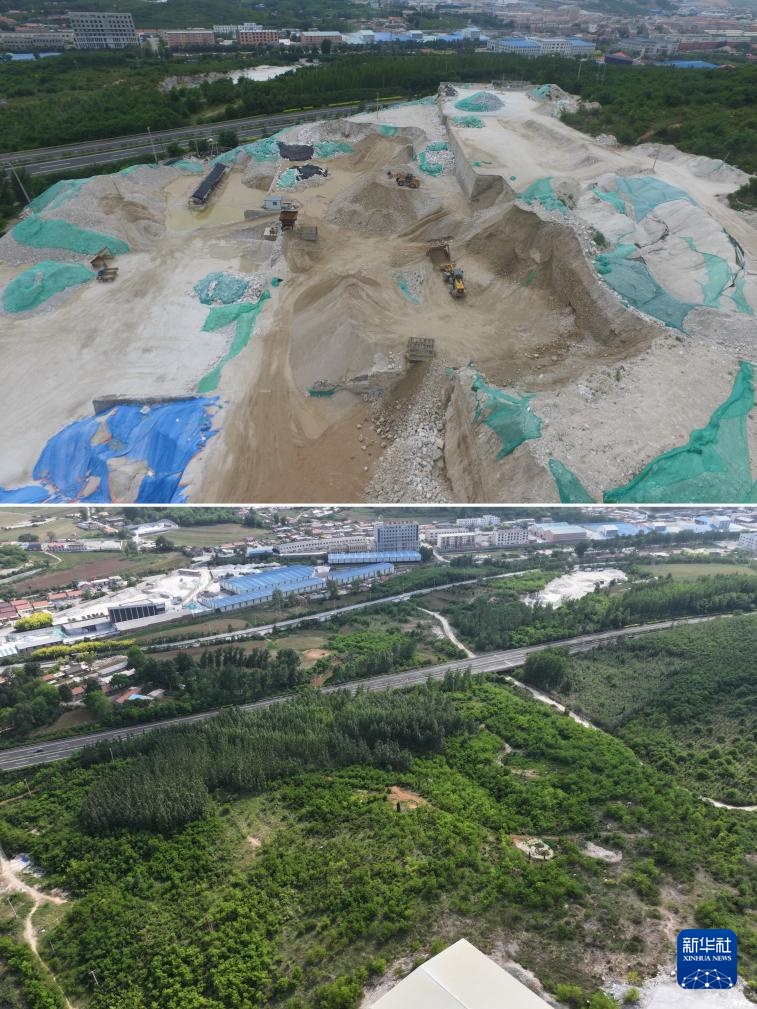 拼版照片:上图为2019年8月6日拍摄的辽宁省海城市一处菱镁矿开采现场(无人机照片,新华社发);下图为6月6日拍摄的同一位置经过整改复绿的菱镁矿(无人机照片,新华社记者 吴青昊 摄)。