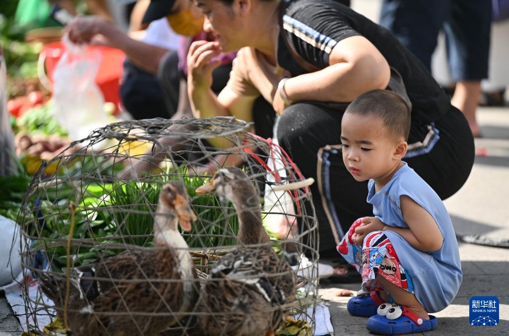 6月7日,小朋友在打量集市上售卖的鸭子。