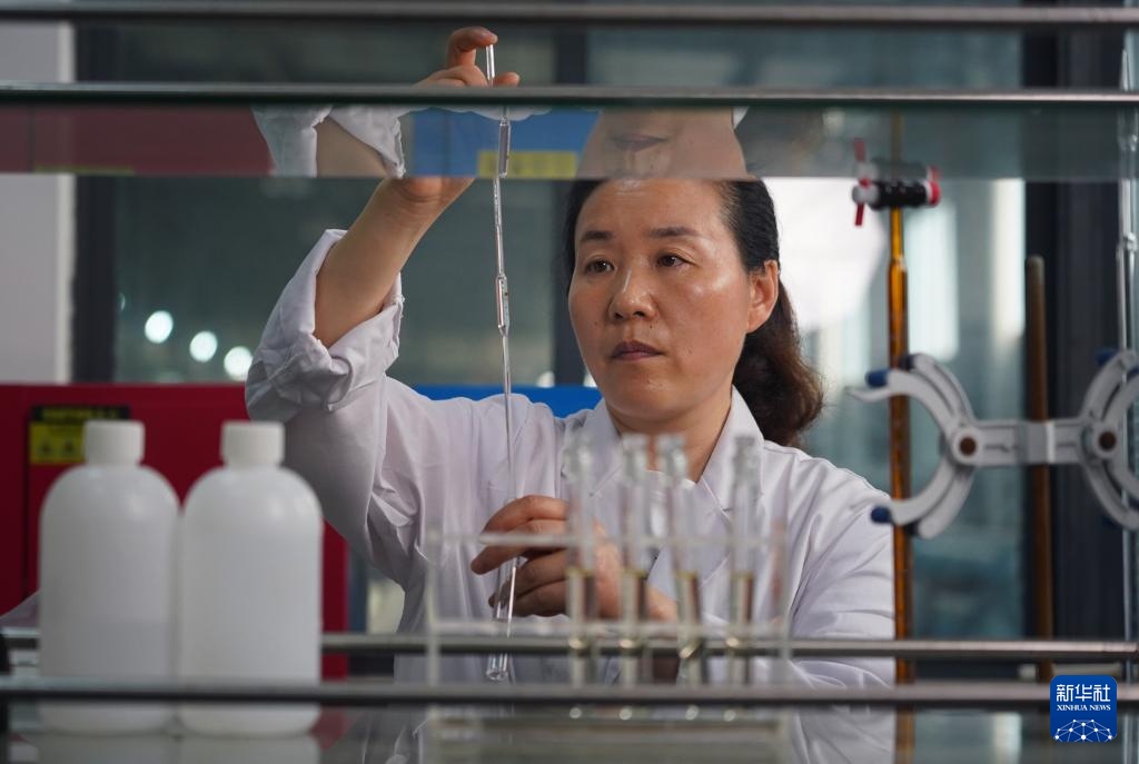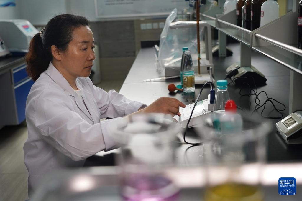 江苏丰海新能源淡化海水发展有限公司的工作人员正在对海水淡化后生产的纯净水进行检测(6月7日摄)。