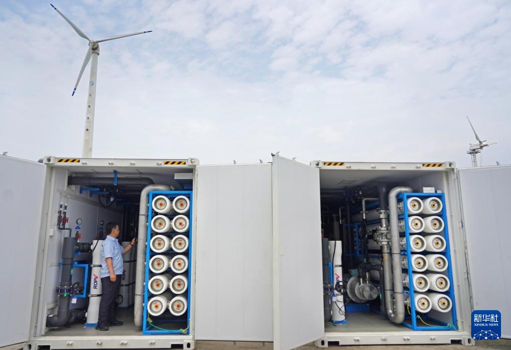 6月7日,工作人员在对海水淡化集装箱进行调试。