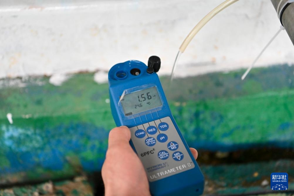 6月7日,江苏丰海新能源淡化海水发展有限公司工作人员杨新国在海水淡化车间通过测水仪检测三级产水电导率。