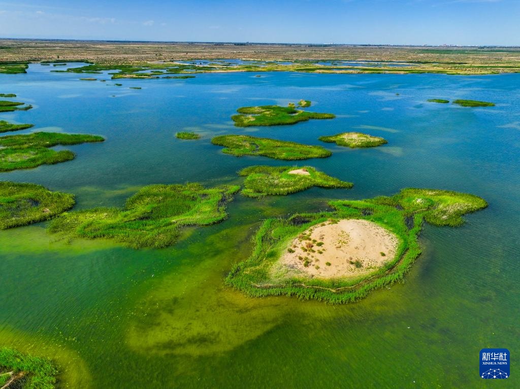 这是位于巴彦淖尔市磴口县的奈伦湖国家湿地公园(6月5日摄,无人机照片)。