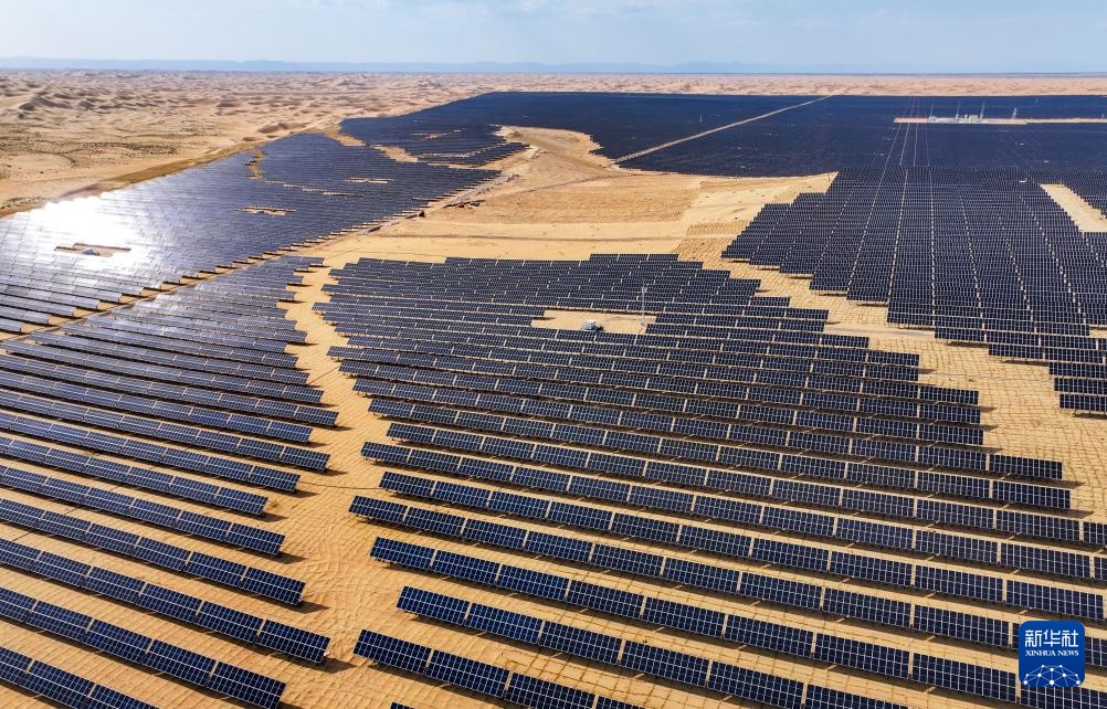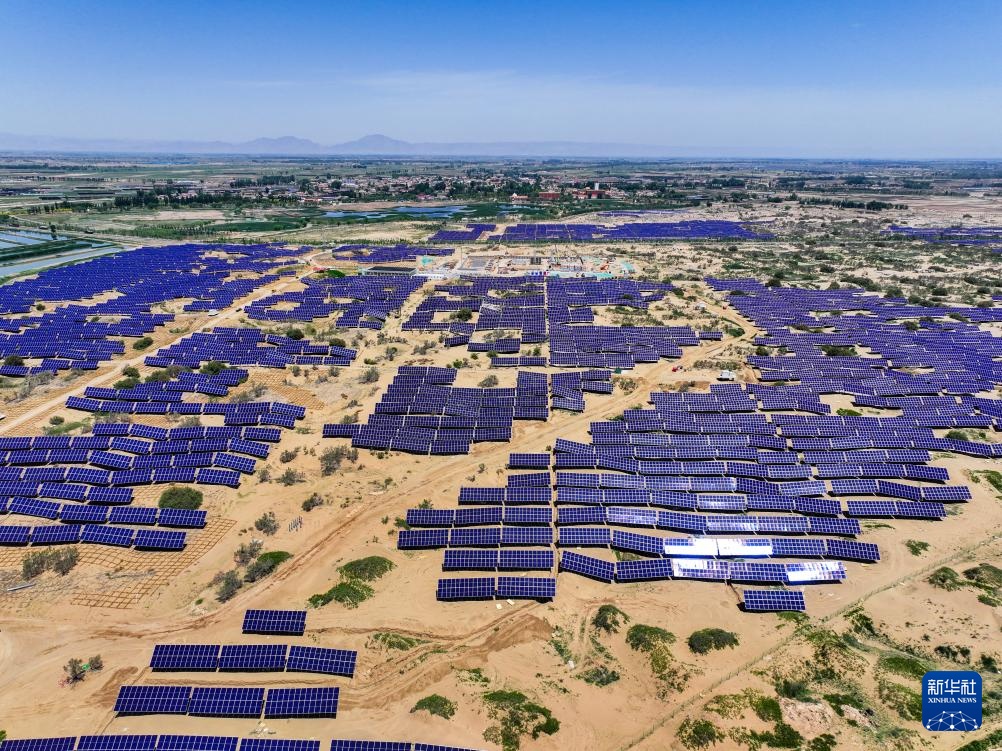 这是6月5日拍摄的位于巴彦淖尔市磴口县的乌兰布和东北部新能源基地100万千瓦光伏先导工程项目,该项目地处乌兰布和沙漠(无人机照片)。