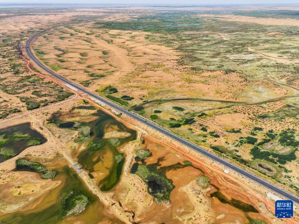 在鄂尔多斯市杭锦旗库布其沙漠,穿沙公路两侧绿意葱茏(6月6日摄,无人机照片)。