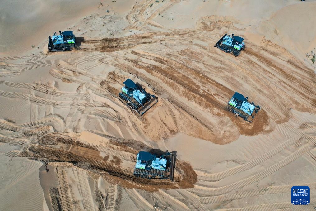 6月7日,在鄂尔多斯市达拉特旗境内的库布其沙漠,工程机械在平整沙地、开展光伏治沙工程建设(无人机照片)。