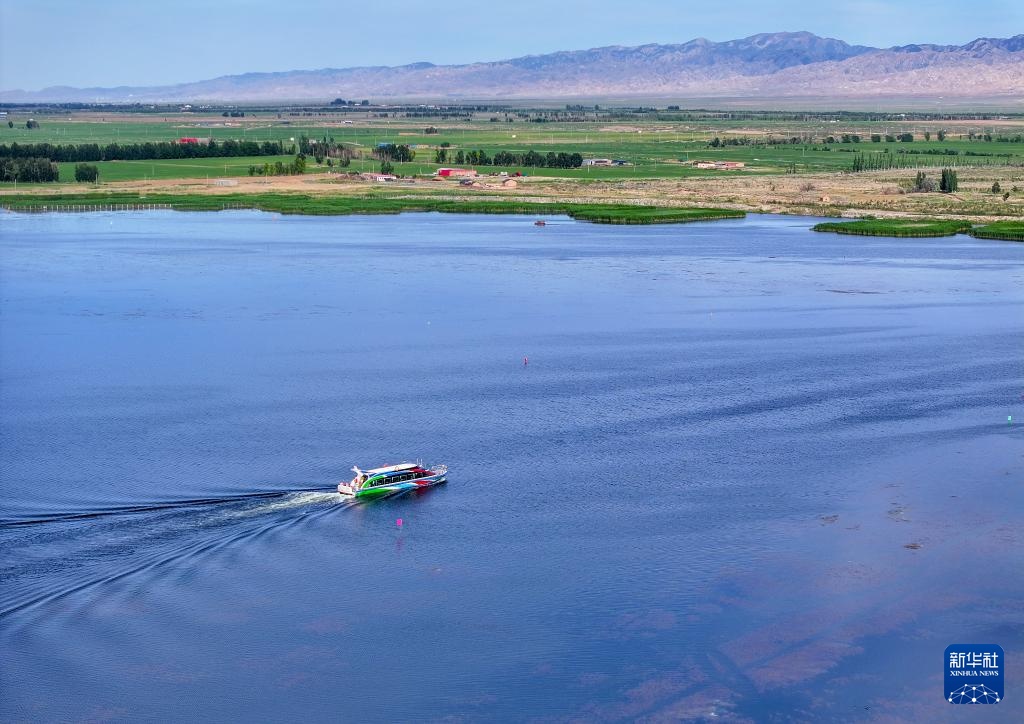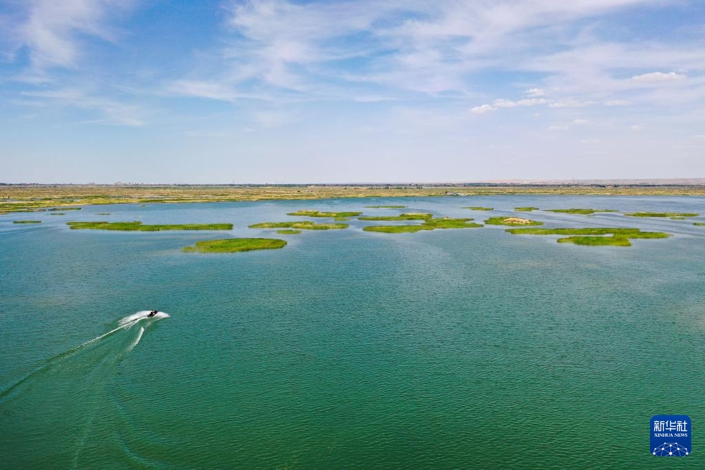 6月5日,在巴彦淖尔市磴口县奈伦湖国家湿地公园,摩托艇行驶在湖面上(无人机照片)。