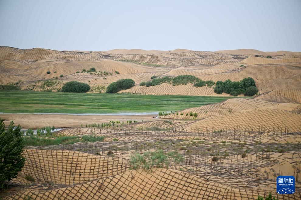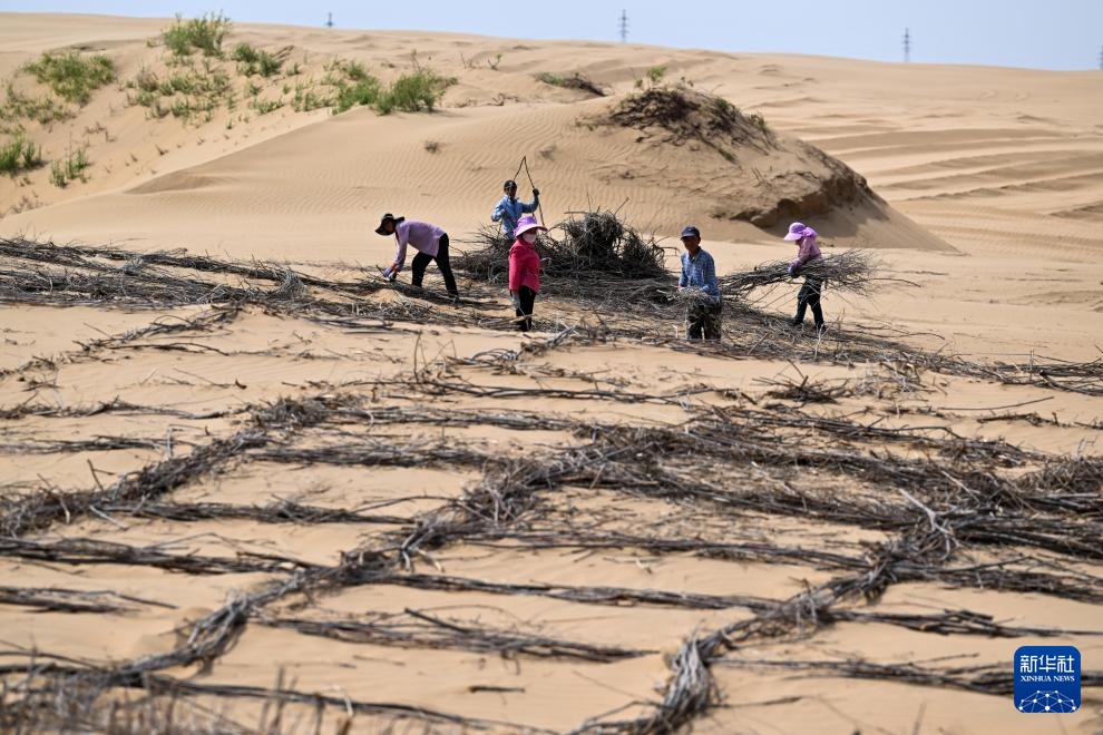 6月7日,在鄂尔多斯市达拉特旗境内的库布其沙漠,工人在治沙。