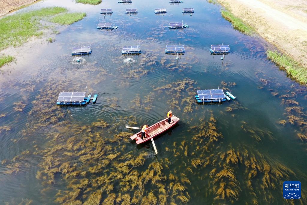 6月4日,在乌拉特前旗九排干人工湿地,工作人员在巡检太阳能曝气机。该设备可对进入乌梁素海的水体曝气增氧(无人机照片)。