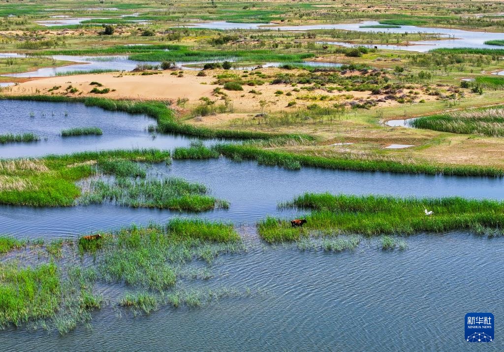 这是在鄂尔多斯市达拉特旗拍摄的黄河“十大孔兑”之一的黑赖沟流域景色,当地生态得到明显改善(6月7日摄,无人机照片)。