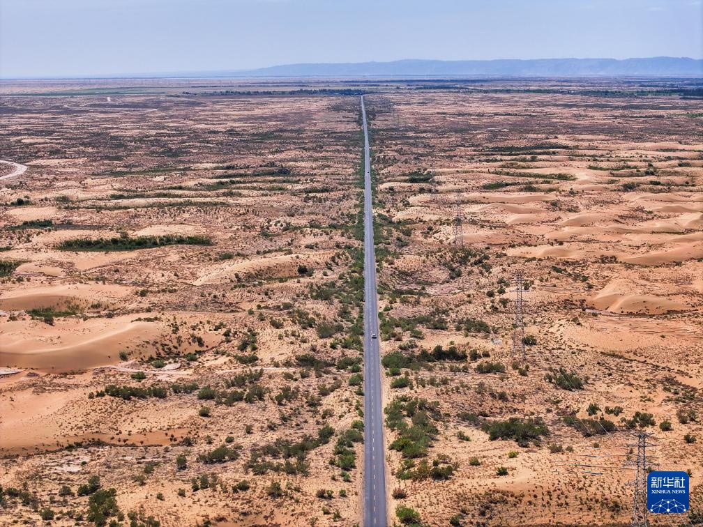 在巴彦淖尔市磴口县,公路穿越乌兰布和沙漠(6月5日摄,无人机照片)。