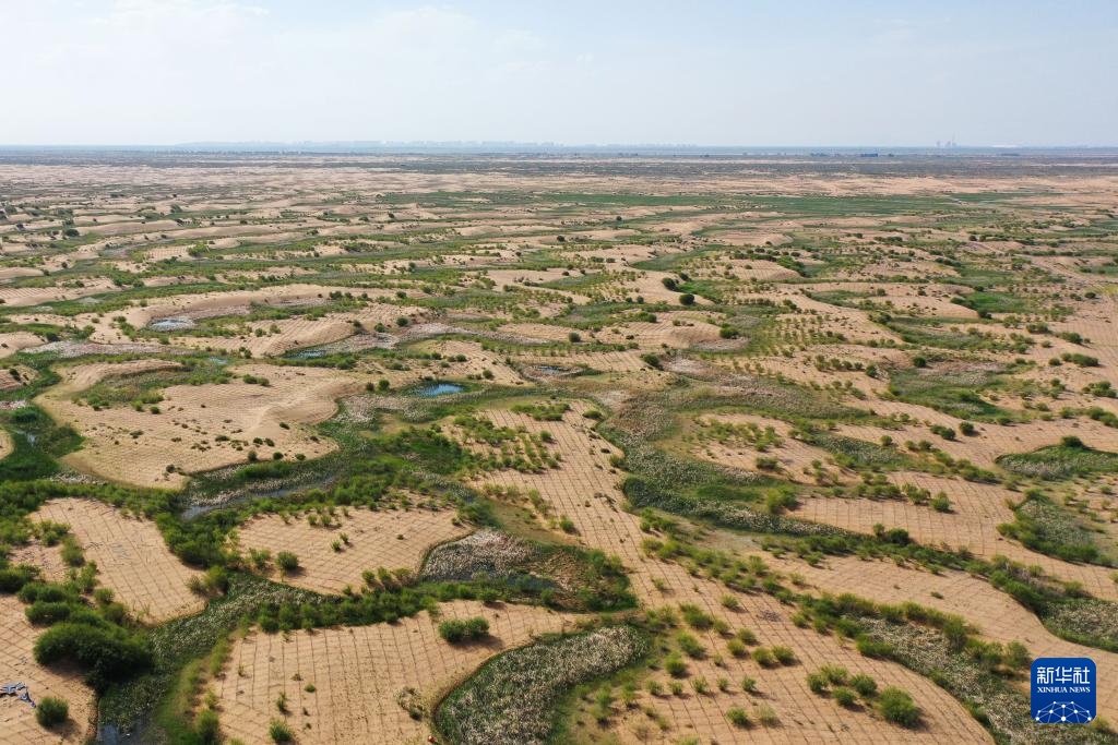 6月7日,在鄂尔多斯市达拉特旗境内的库布其沙漠,工人在治沙(无人机照片)。