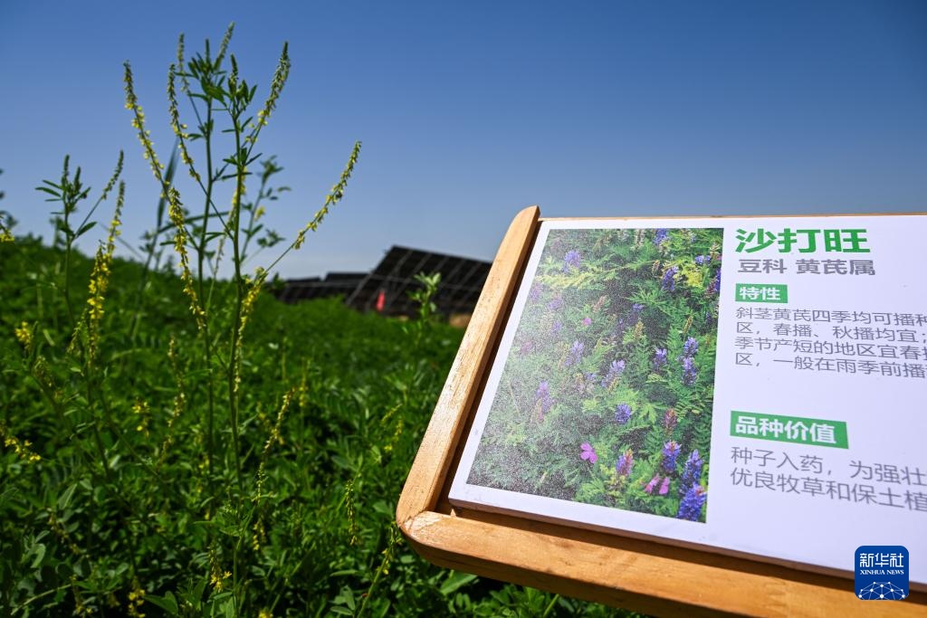 这是在位于巴彦淖尔市临河区的国营新华林场防沙治沙和光伏一体化项目拍摄的当地种植的沙生植物(6月5日摄)。