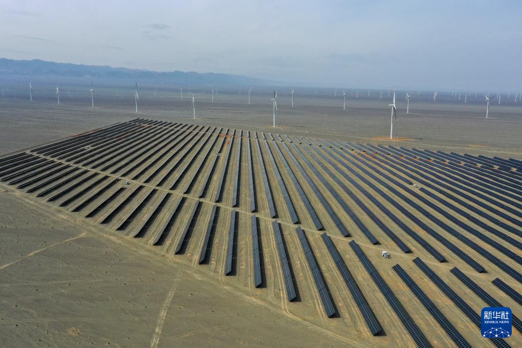 这是在新疆哈密市伊吾县拍摄的哈密—重庆±800千伏特高压直流输电工程配套新能源项目(3月23日摄,无人机照片)。