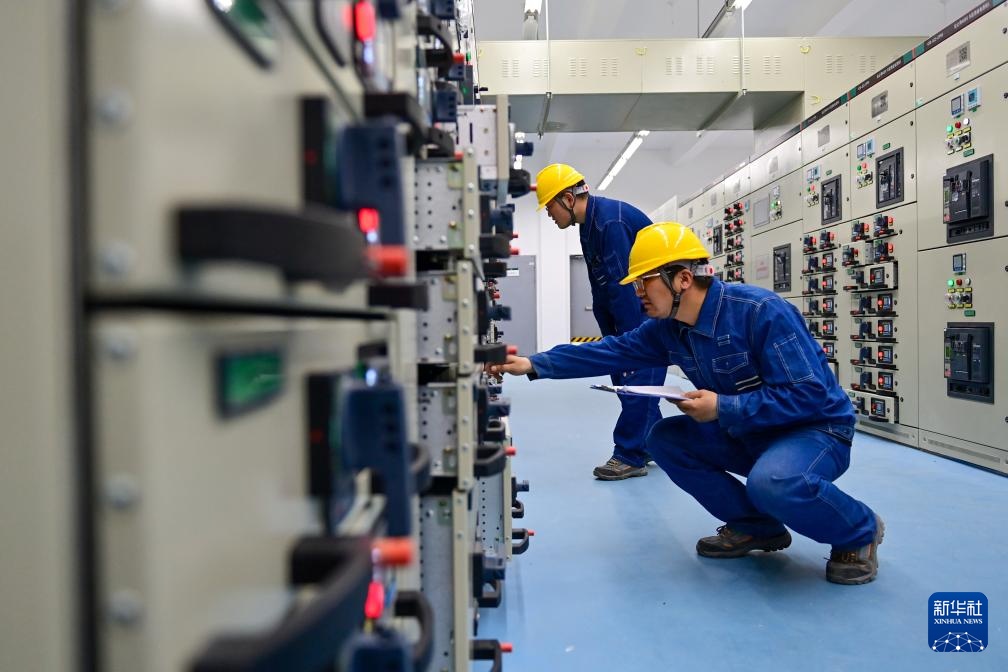 6月10日,在哈密—重庆±800千伏特高压直流输电工程新疆送端站——巴里坤换流站,运检人员在配电室进行巡检工作。