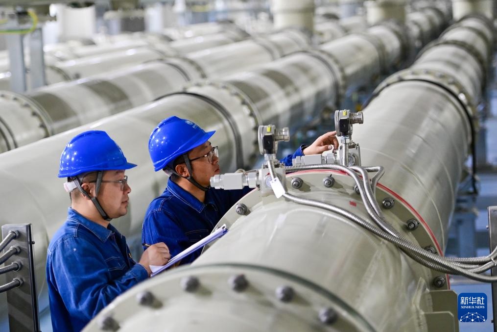 6月10日,在哈密—重庆±800千伏特高压直流输电工程新疆送端站——巴里坤换流站,运检人员在GIS室进行压力表检查。