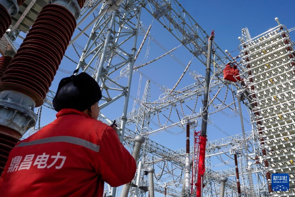 在哈密—重庆±800千伏特高压直流输电工程新疆送端站——巴里坤换流站,施工人员进行电容器组设备引线安装(3月21日摄)。