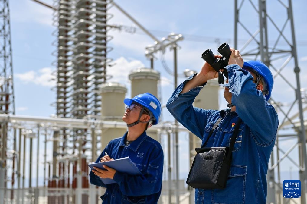 6月10日,在哈密—重庆±800千伏特高压直流输电工程新疆送端站——巴里坤换流站,运检人员在换流变区域进行红外检测工作。