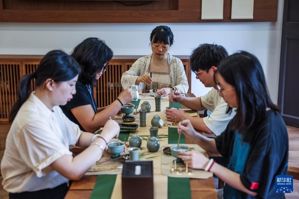 6月10日,游客在子城欢喜书店“江湖书局”民艺巷沉浸式体验传统篆香技艺。
