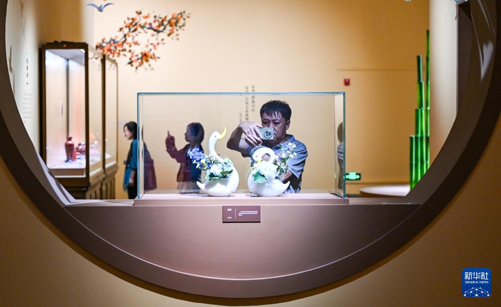 6月10日,参观者在拍摄一件名为“暖光里的葵语”的参展琉璃作品。