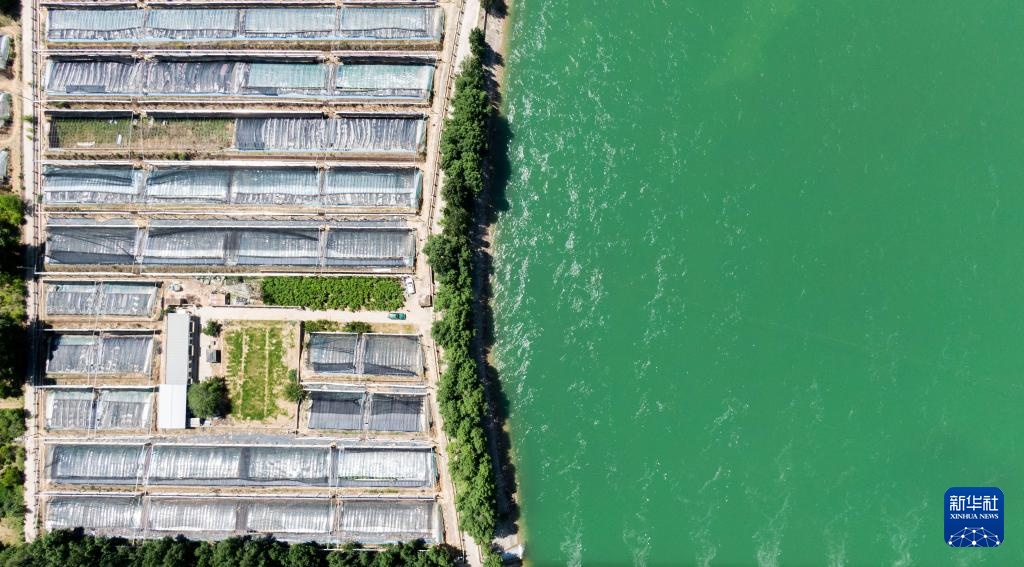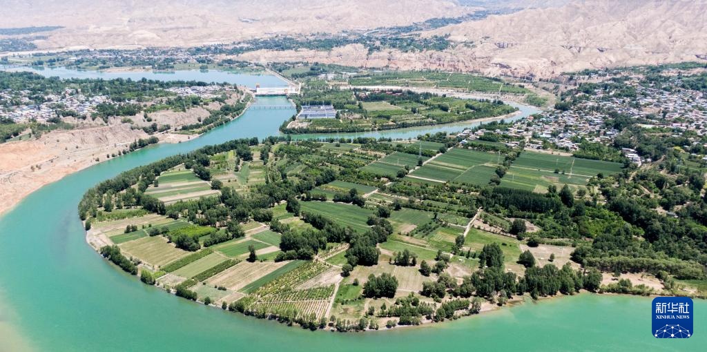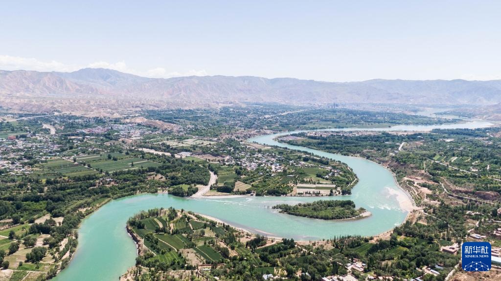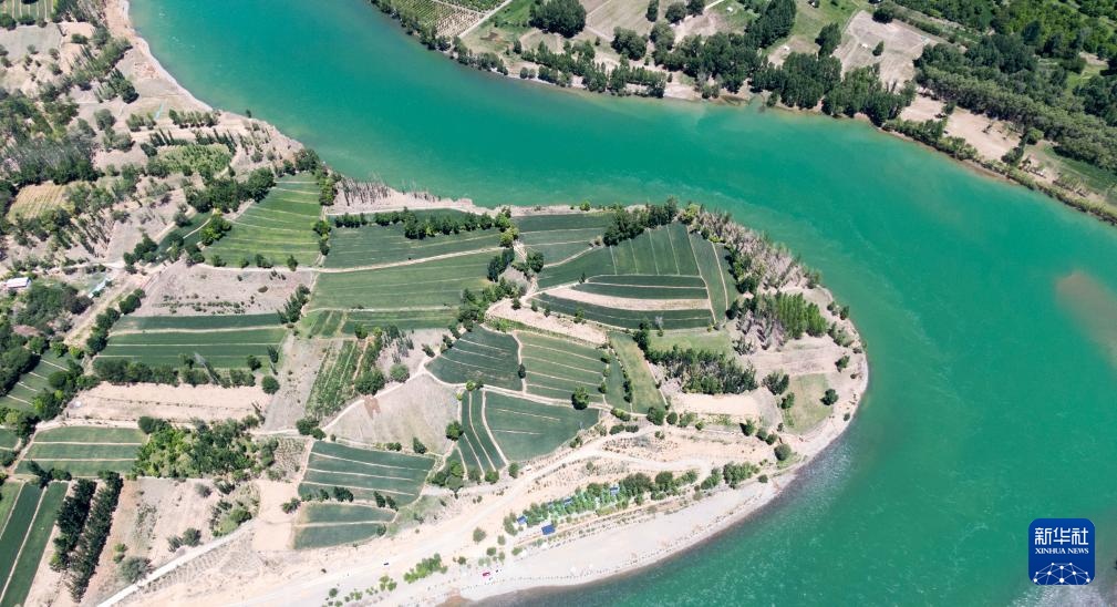 高原夏日,青海省黄南藏族自治州尖扎县境内的黄河碧波荡漾。蓝天白云、清清河水和岸边村落共同构成秀丽的夏日美景。